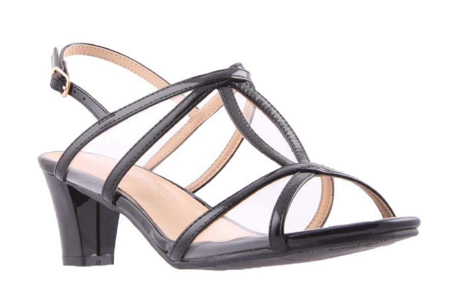 Deena by Simona Ricci is a women’s heeled sandal featuring a patent upper with clear panels and a buckled strap.
