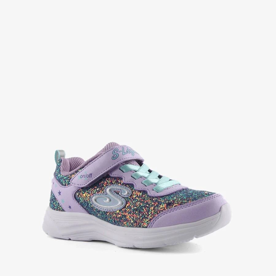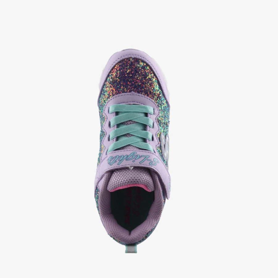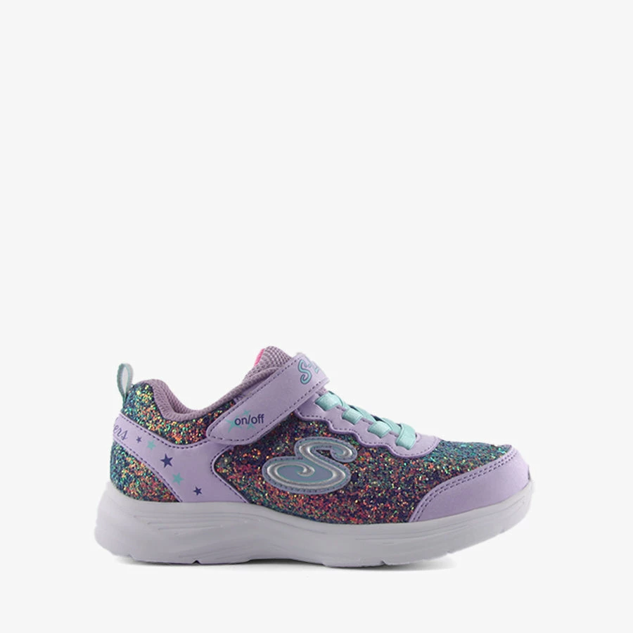 Glitter N Glow by Skechers is a kids sneaker featuring a rock glitter sparkling textured fabric and smooth synthetic upper in a stretch laced slip on with stitching and overlay accents.