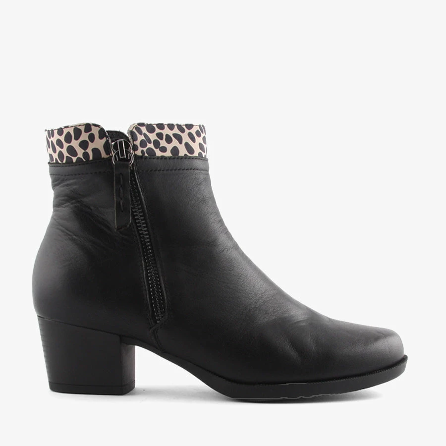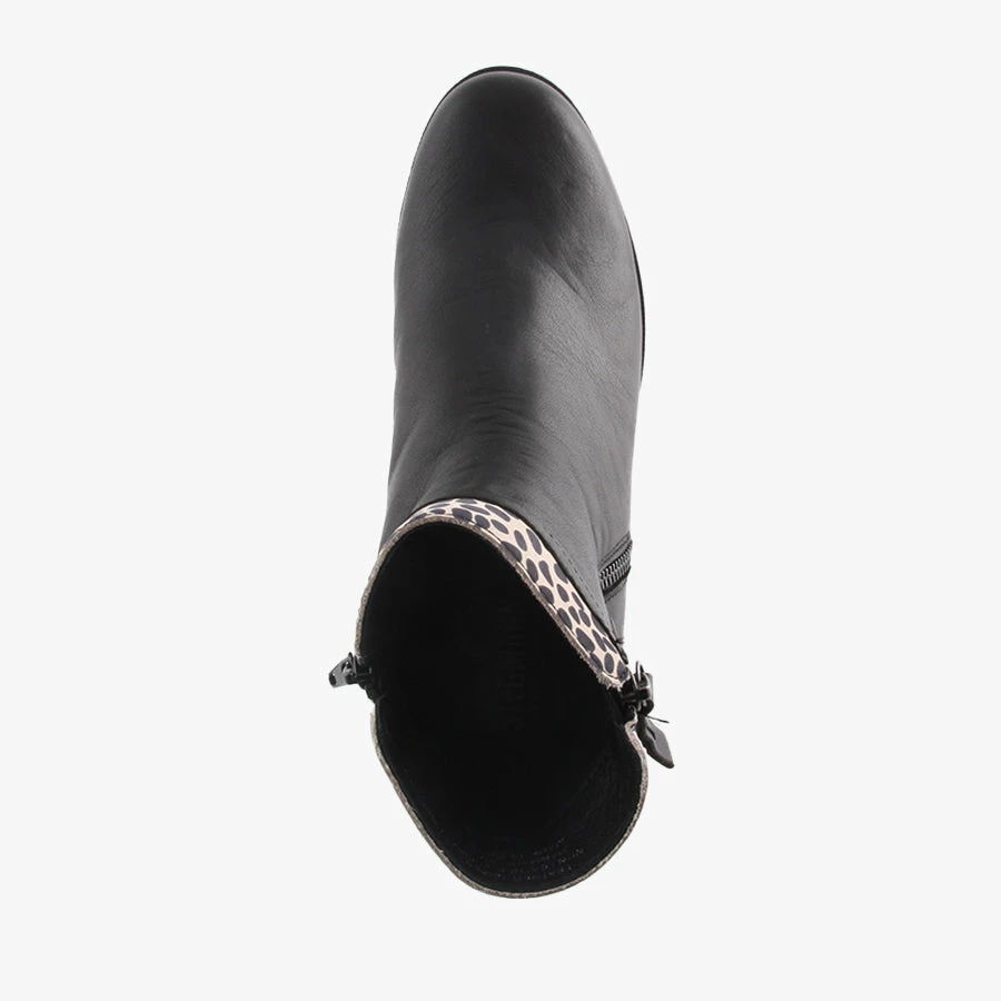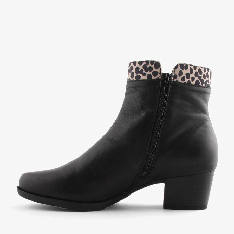 Licorice by Stegmann is a women’s ankle boot featuring a soft leather upper inside zipper, animal print cuff and a comfortable lightly padded insole.