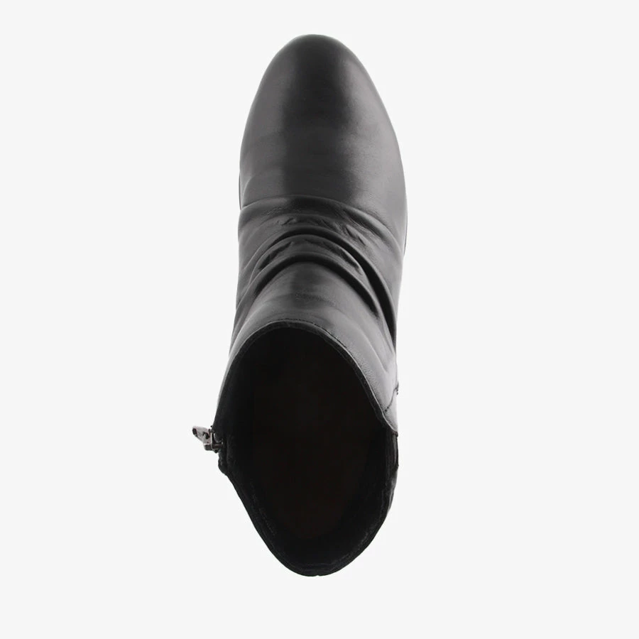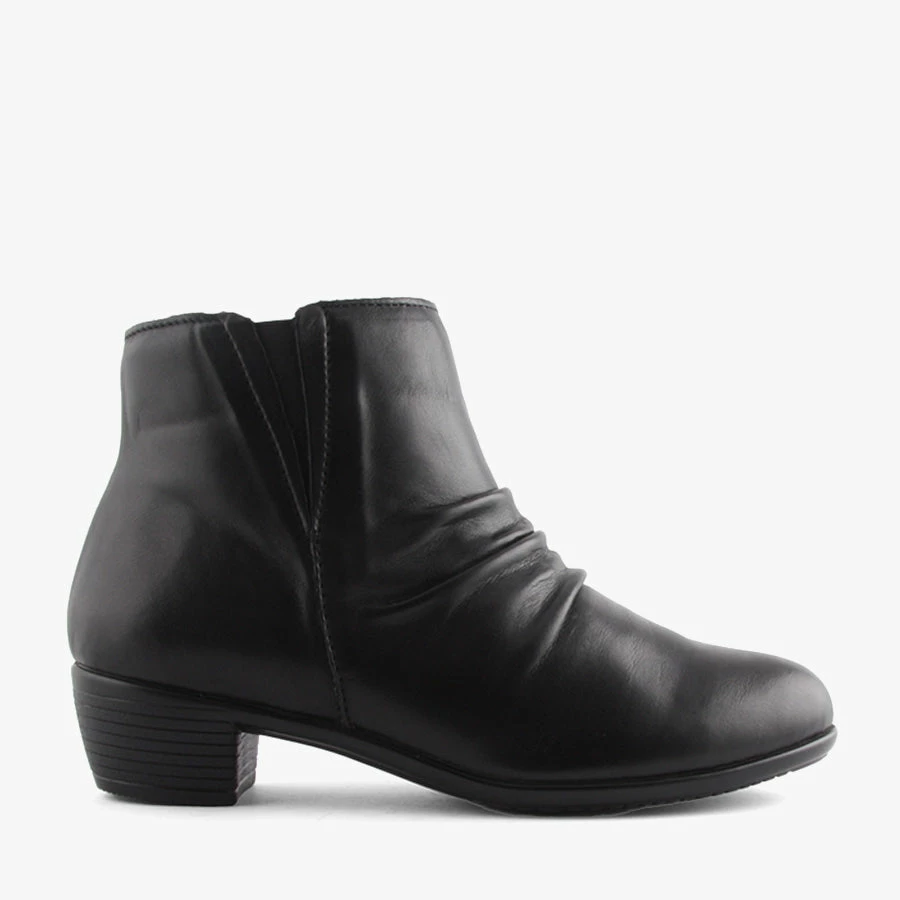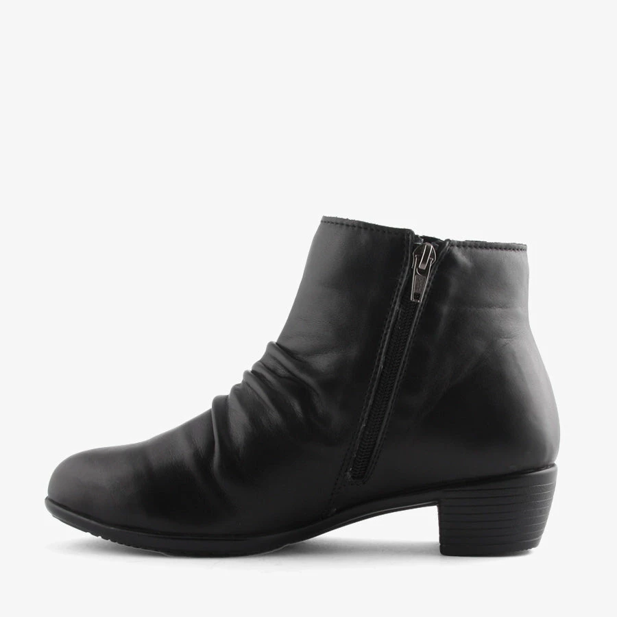 Yanny by Stegman is a women’s ankle boot featuring leather upper, an inside zip for functional entry and a light weight comfortable sole and heel.