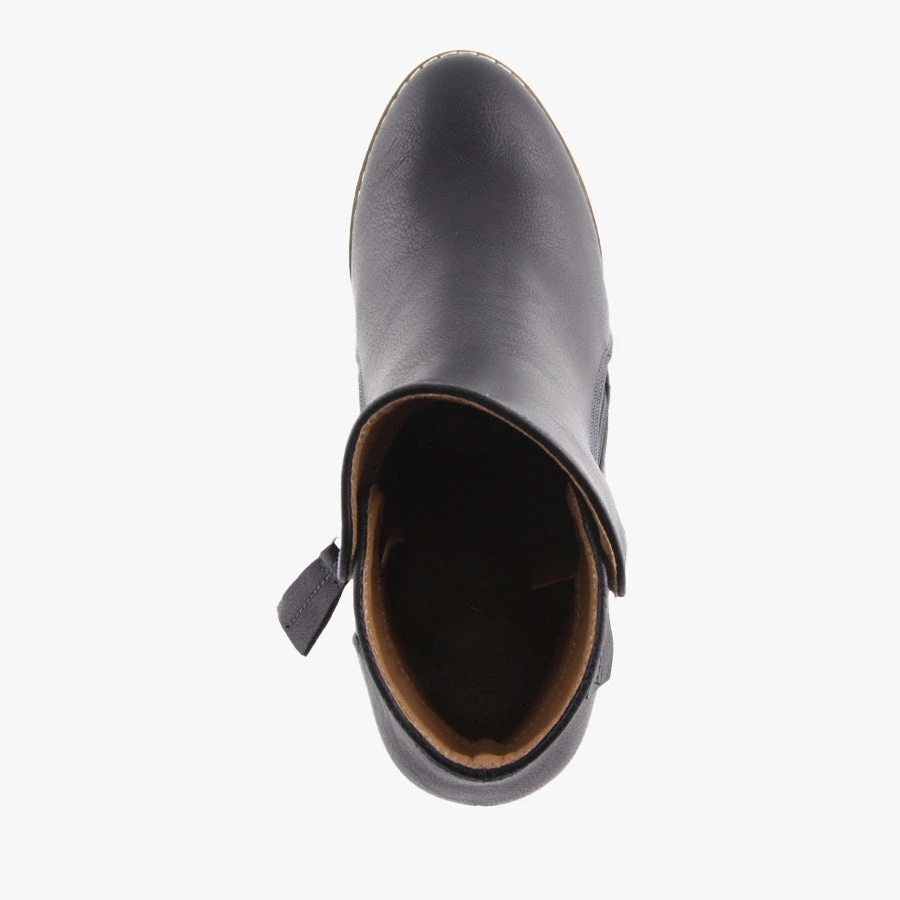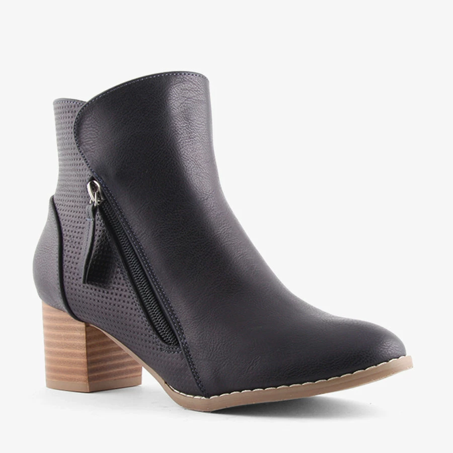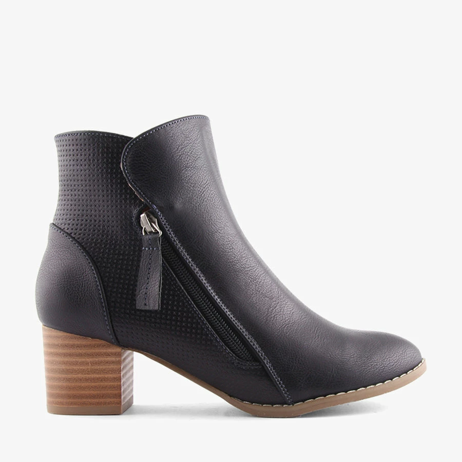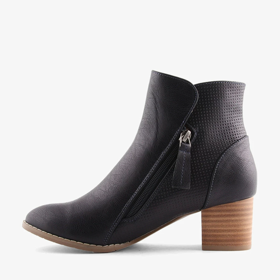 Whitney by Step on Air is a women’s ankle boot featuring dual working side zippers with a perforated look pattern finished with an almond toe and low stacked heel.
