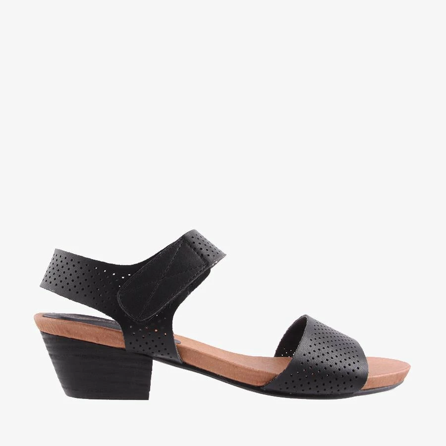 Nail by Step on Air is a women’s sandal that features a perforated design, velcro strap and stacked block heel.