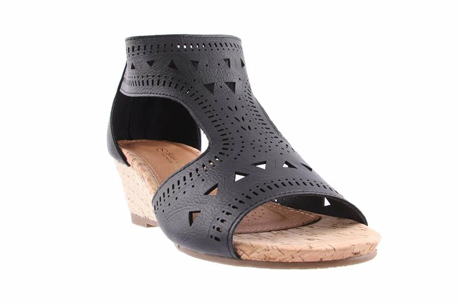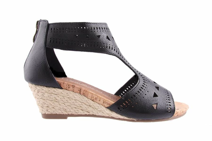 Silvie by Step on Air features a mid height stacked espadrilles wedge, laser cut upper and rear zip fastening with peep toe.