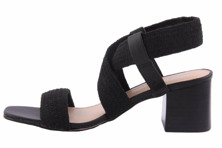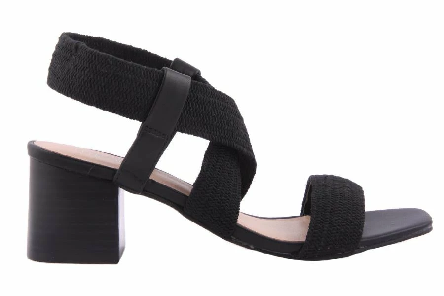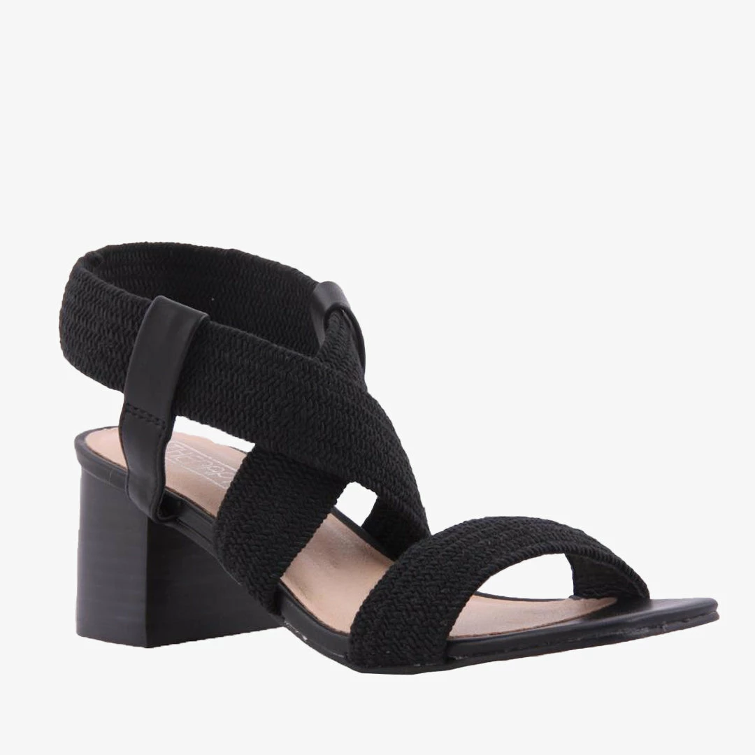 Bronte by Therapy is a women’s heeled sandal featuring stretch cross over straps on a mid block heel.