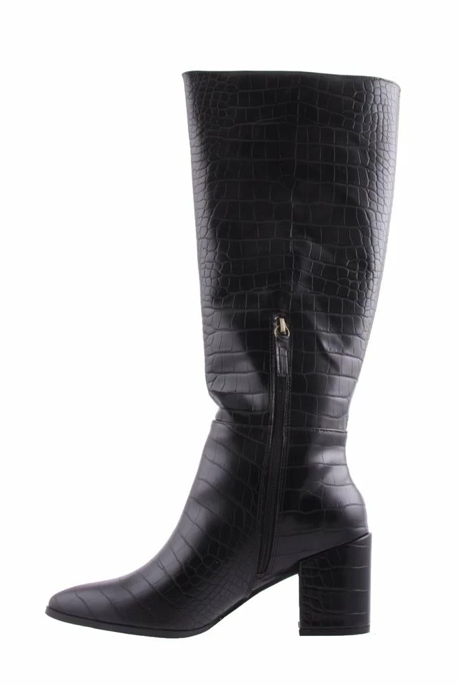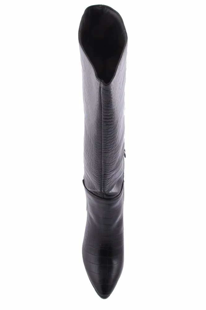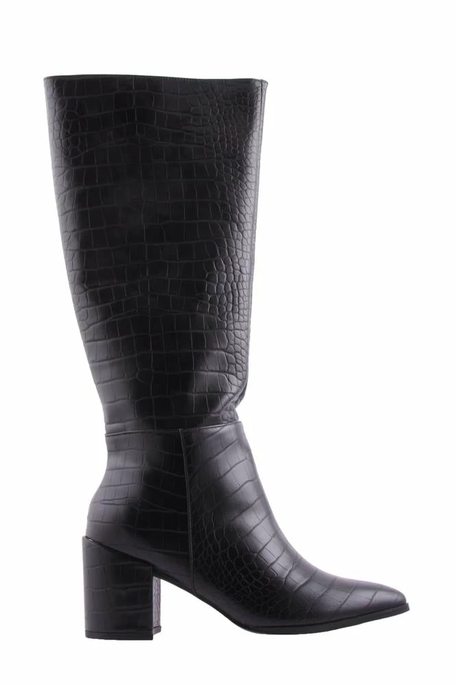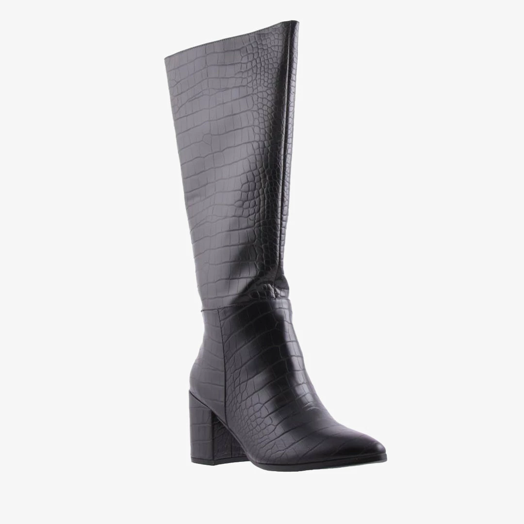 Make a statement with Julia. This women’s knee high boot features a croc patterned print and a half length side zipper on a matching heel.