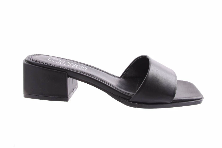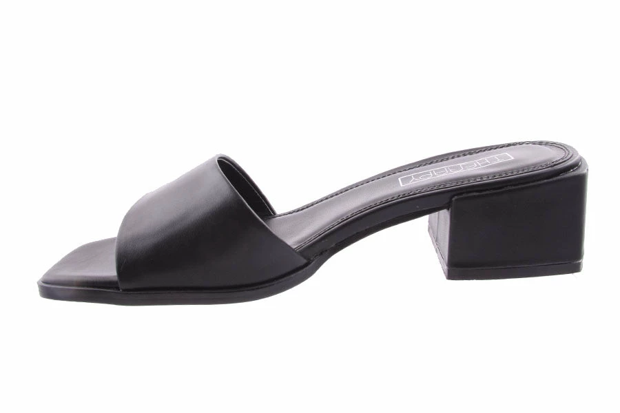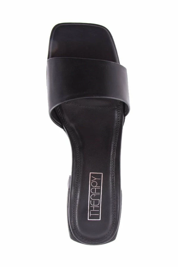 Slide into Stormi by Therapy. Stormi features a low block heal, square toe and a simple wide strap across the toe.