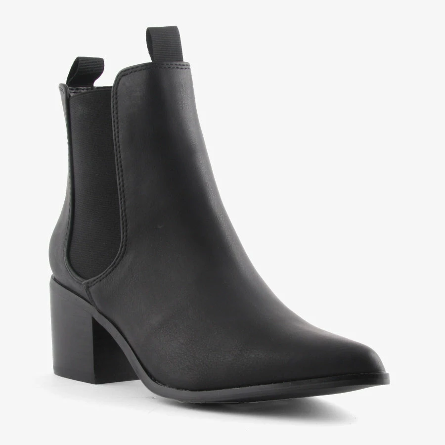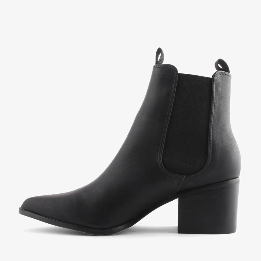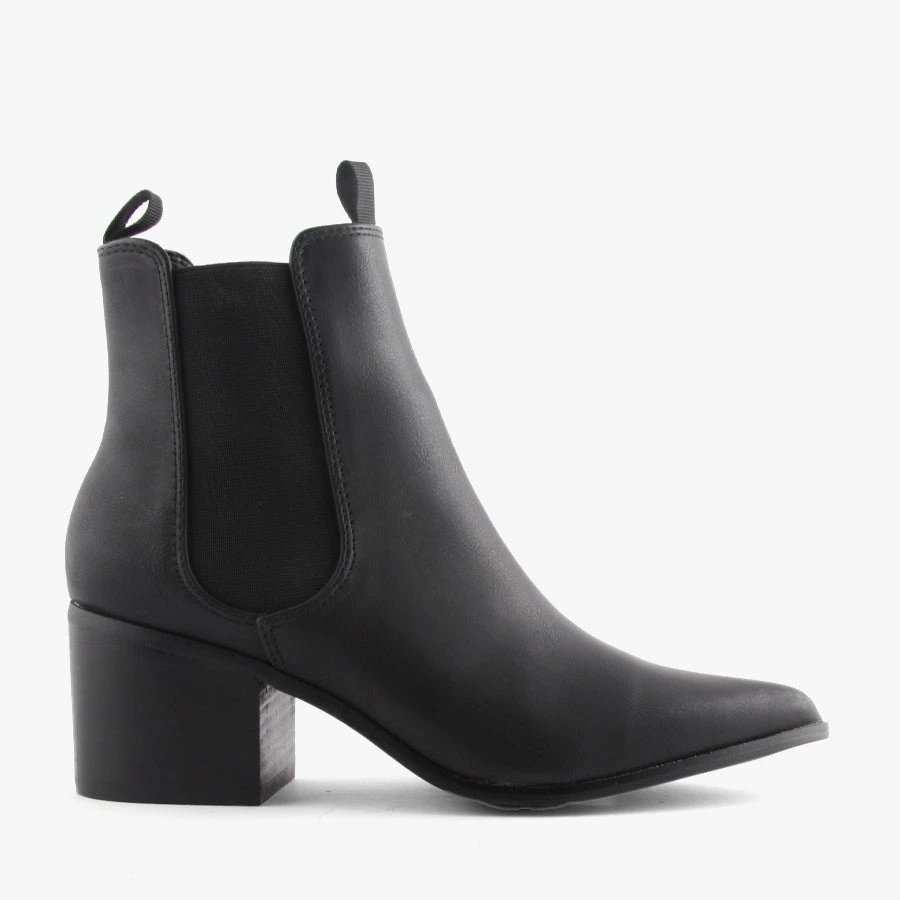 Filo by Verali is an elastic-sided boot with a block heel and pointed toe. With a smart leather-look upper, Filo can easily be dressed up or down.