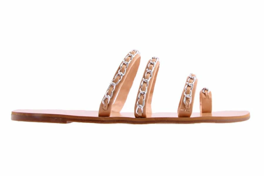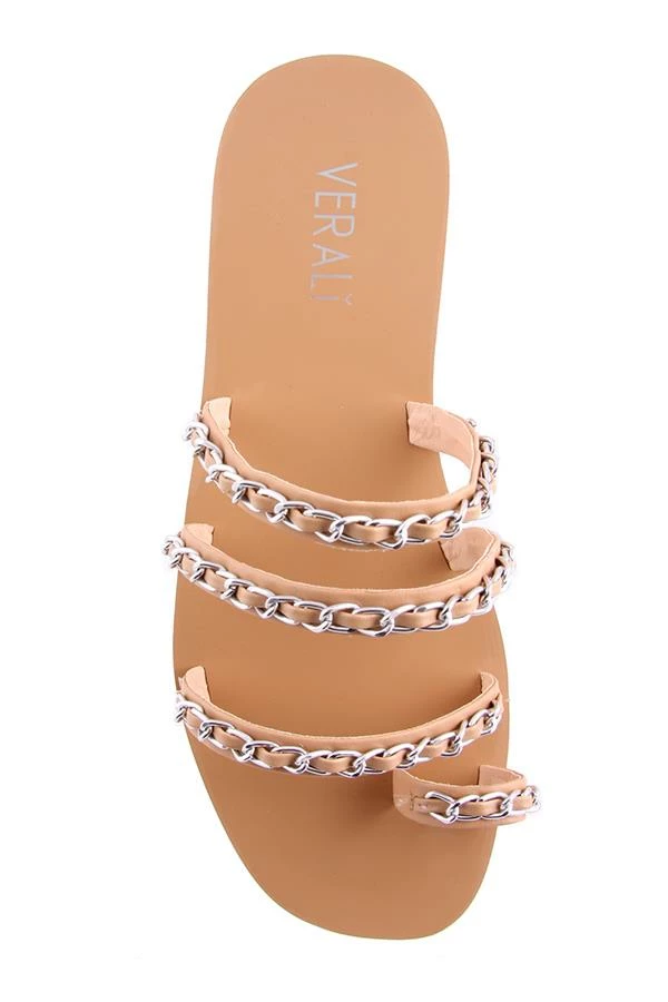 Cindy by Verali is a women’s sandal featuring slimline straps that wrap around the foot comfortably with a silver chain detail overlay.
