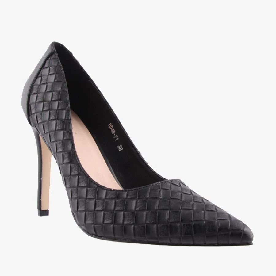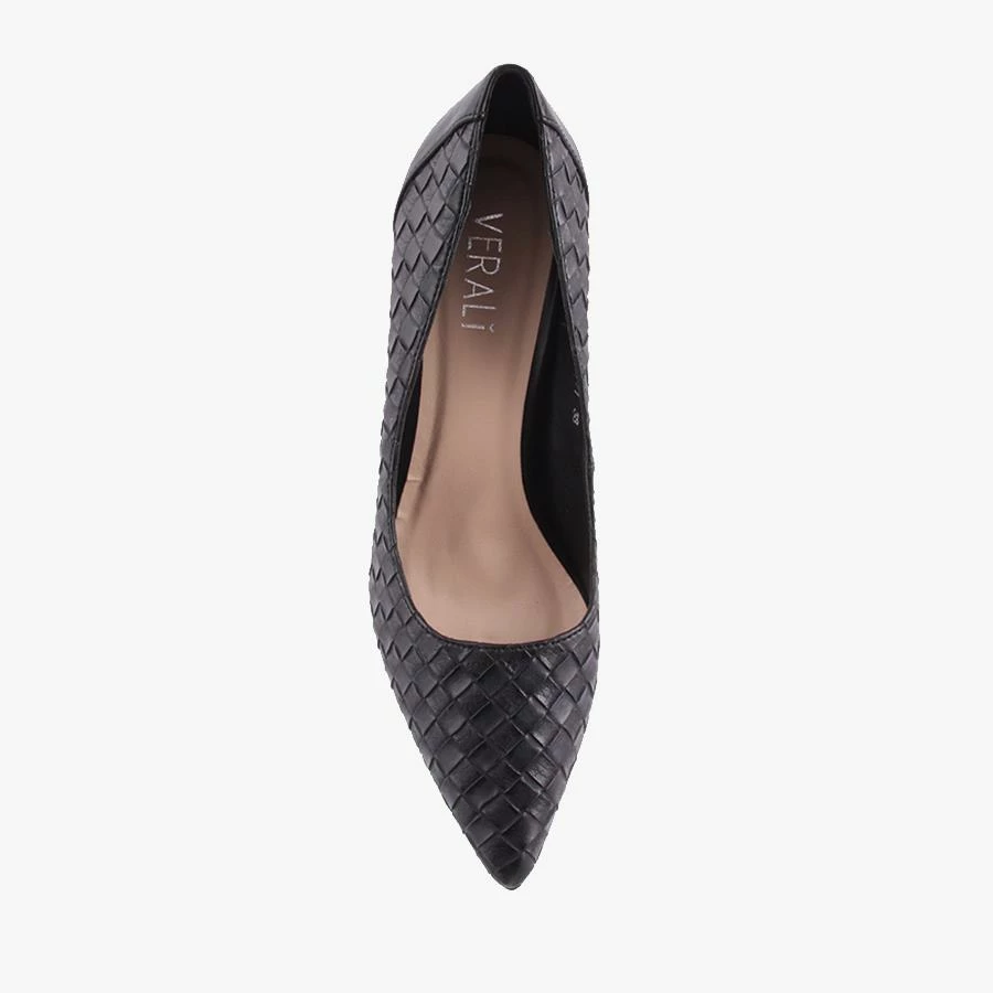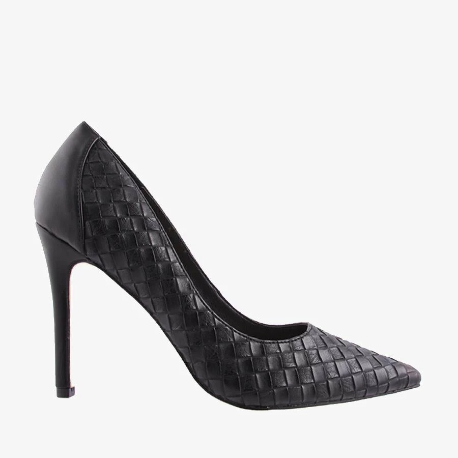 Huxley by Verali is a sleek dramatic stiletto heel, featuring a pointed party pump with a crafted woven finish and can be styled for work or play.