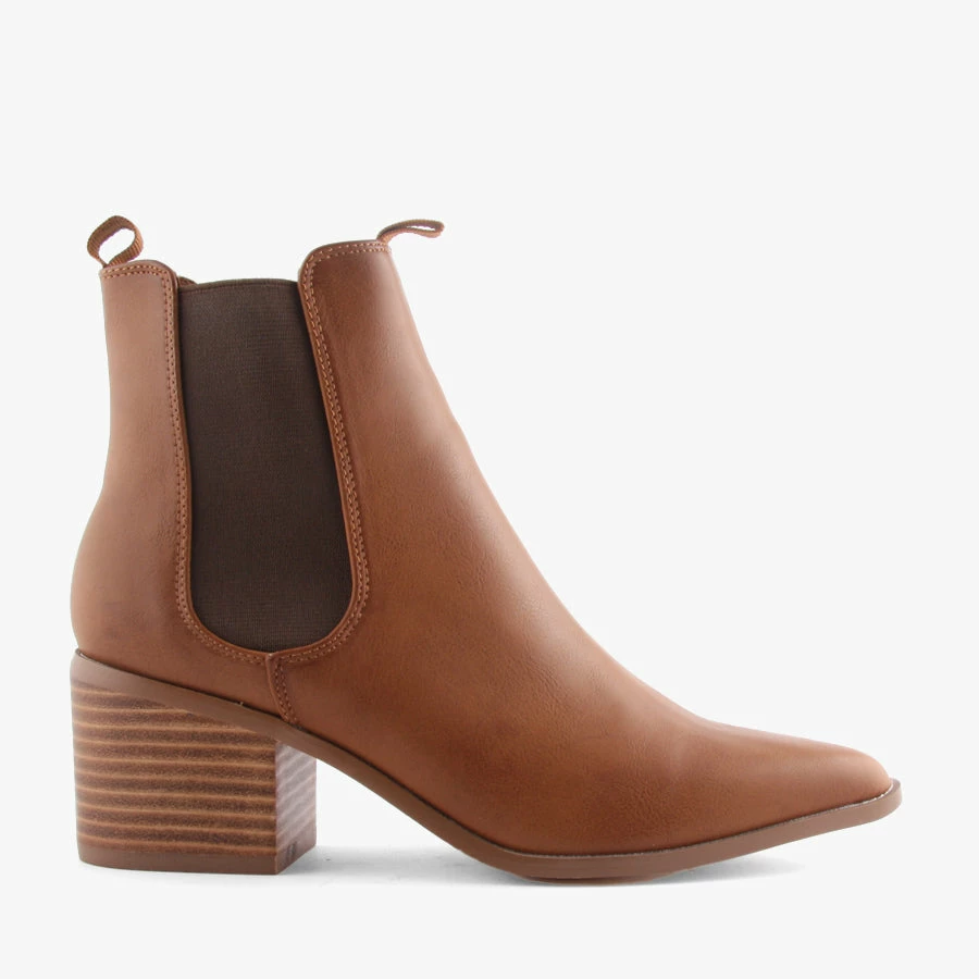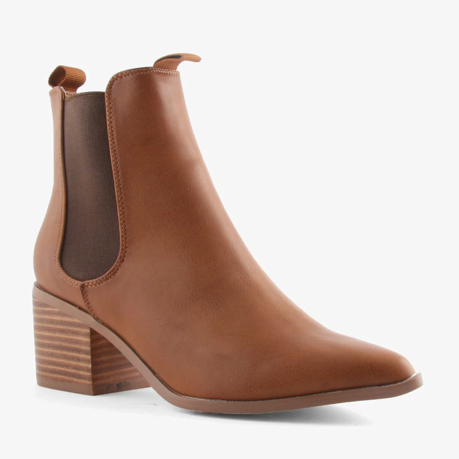 Filo by Verali is an elastic-sided boot with a block heel and pointed toe. With a smart leather-look upper, Filo can easily be dressed up or down.