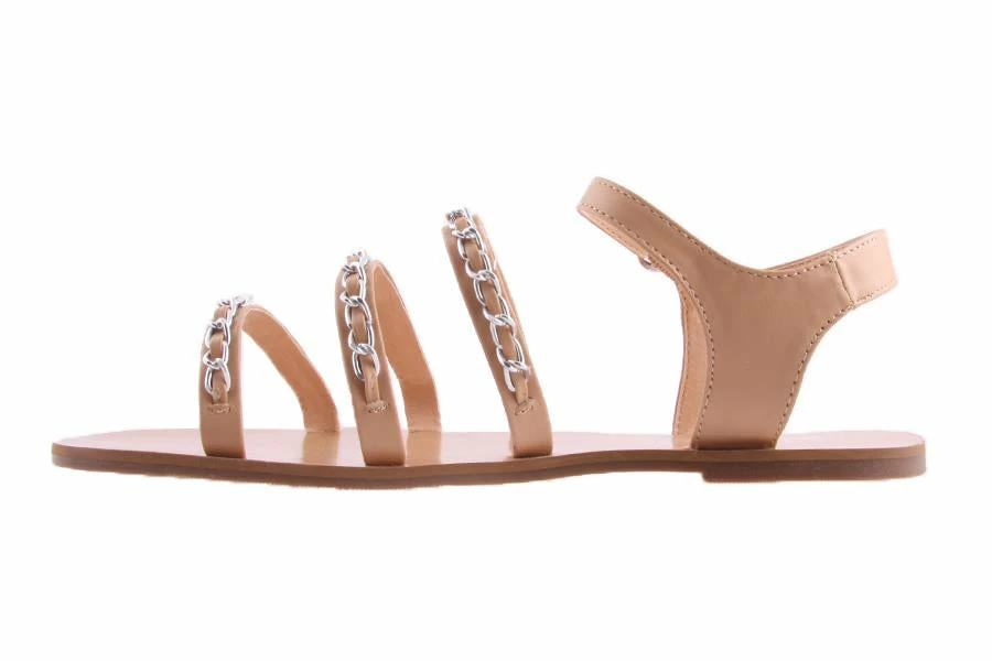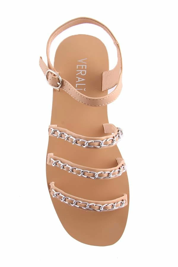 Candice by Verali is a women’s sandal featuring a buckled ankle strap and slimline straps that wrap around the foot comfortably with silver chain detail overlay.