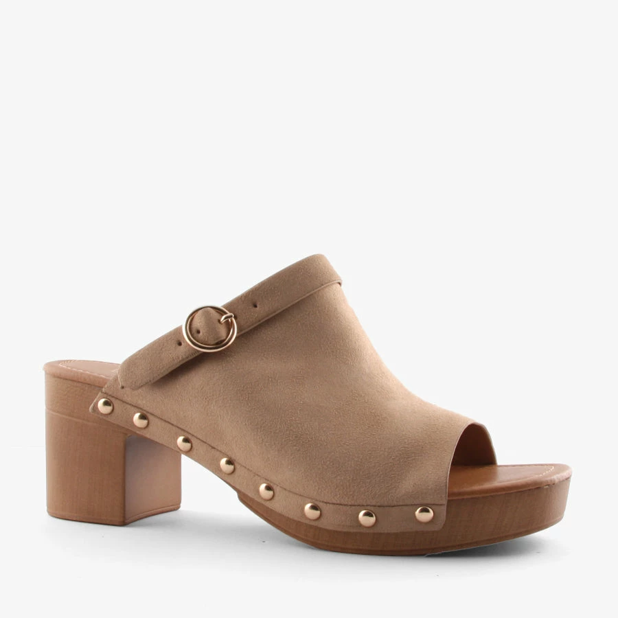 Luella by Verali is a women’s platform slip on low block heel. Features a covered upper and open toe, and includes an adjustable strap and gold stud detailing.
